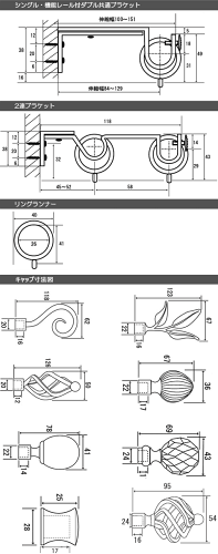 .*-----【個数】-----* ※100mまで 【1mサイズ】 *シングル 2コ *ダブル 2コ *2連 2コ ※200mまで 【2mサイズ】 *シングル 3コ *ダブル 3コ *2連 3コ ※300mまで 【3mサイズ】 *シングル 3コ *ダブル 3コ *2連 3コ ↓↓バナーをクリックすると 「サイズの決め方」のページの移動します↓↓ ■詳細 材質 装飾キャップ:亜鉛ダイキャスト レール本体:スチール ブラケット:スチール リングランナー:鉄製 サイズ レールの太さ:16mm キャップ寸法図 リングランナー、ブラケットの寸法はこちら 付属品 *装飾キャップ(厚地側=キルト・レース側=プレーン) *ポール(厚地/レース側のレール) *取付ブラケット *取付用木ビス(35mm) (※取付箇所により付属のビスで対応できない場合もあります。